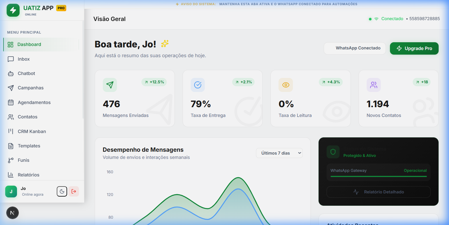 O sistema de automação para WhatsApp mais seguro, luxuoso e completo do mercado. Faça disparos em massa, crie funis avançados e gerencie contatos sem tomar bloqueios.
