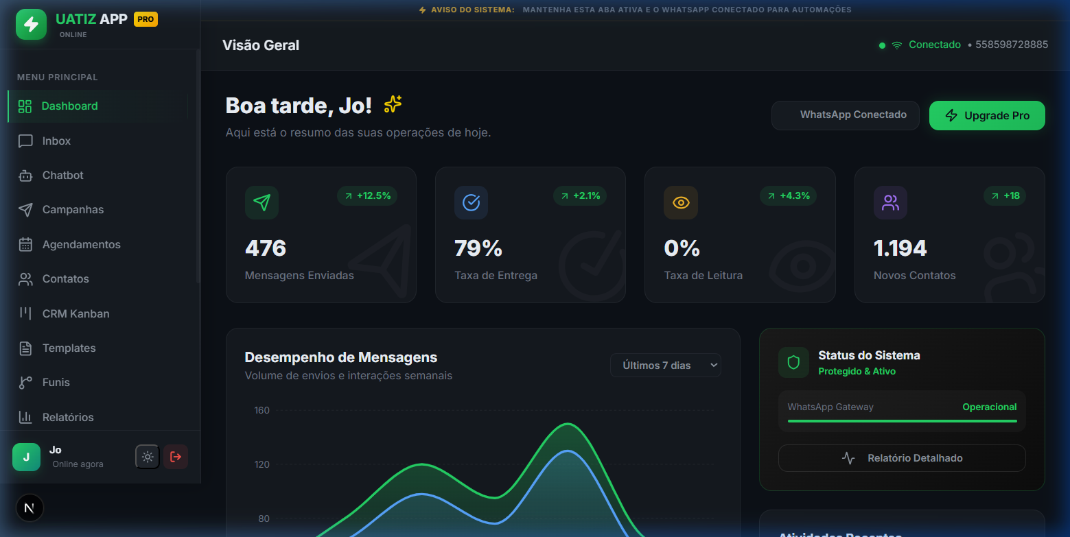 O sistema de automação para WhatsApp mais seguro, luxuoso e completo do mercado. Faça disparos em massa, crie funis avançados e gerencie contatos sem tomar bloqueios.